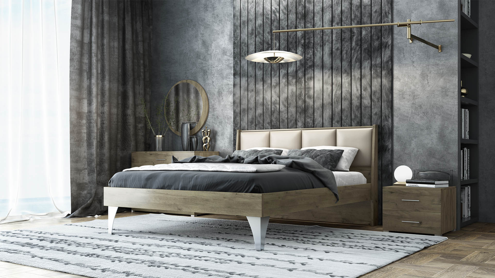 King size bed with fabric headboard made of high quality melamine frame. A modern choice suitable for home and professional use.