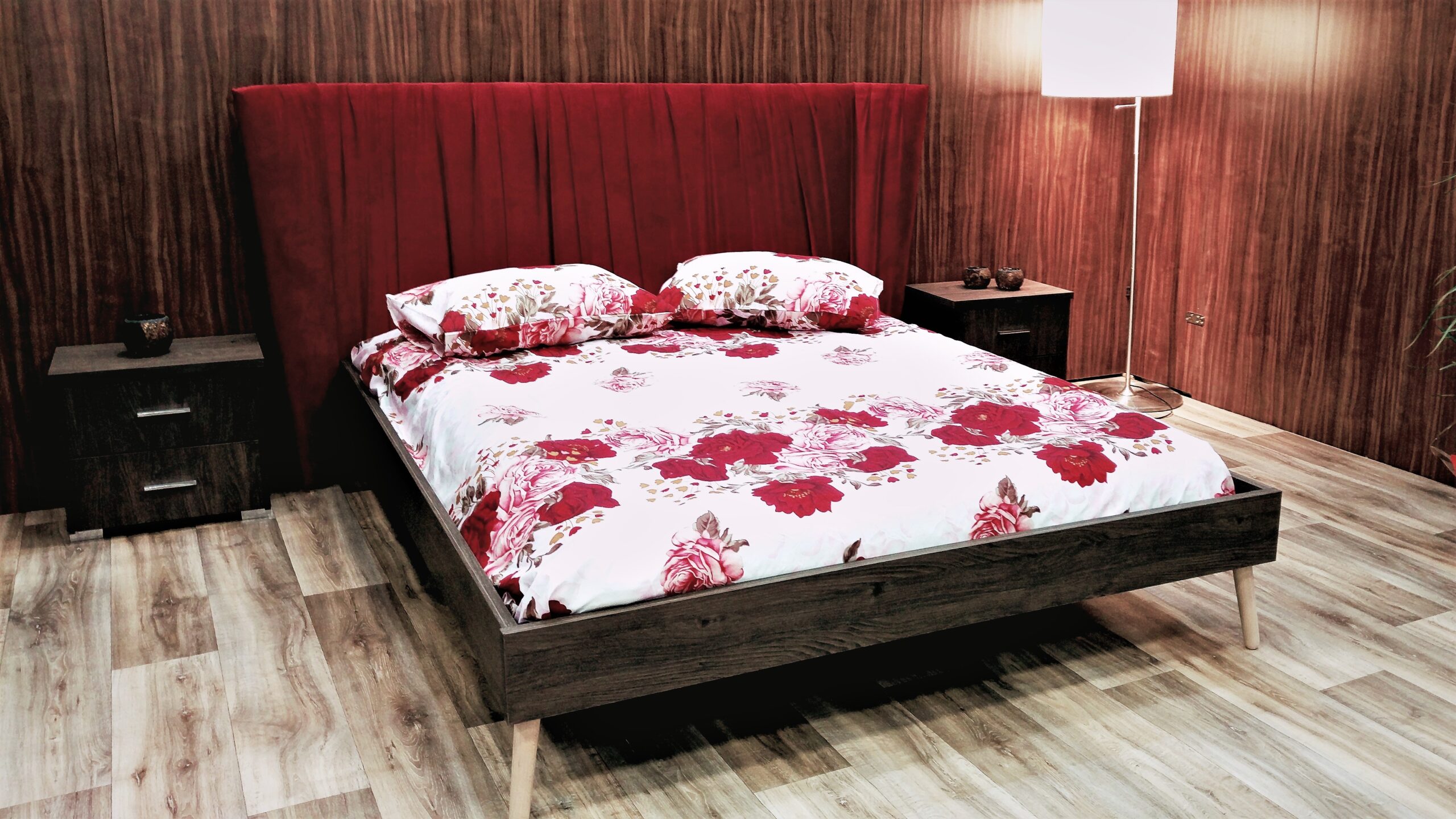 Υπερπολυτελές κρεβάτι Queen με μοναδικό design, κόκκινο χρώμα κεφαλάρι και μελαμίνη υψηλής ποιότητας σε δρυς και άλλα χρώματα. Επίσης δυνατότητα επιλογής σκελετού και ποδαρίσκου με 1. Κλειστό μελαμίνη 2. Ξύλινα πόδια ή 3. Όλο ντυτό. Μία μοντέρνα επιλογή.